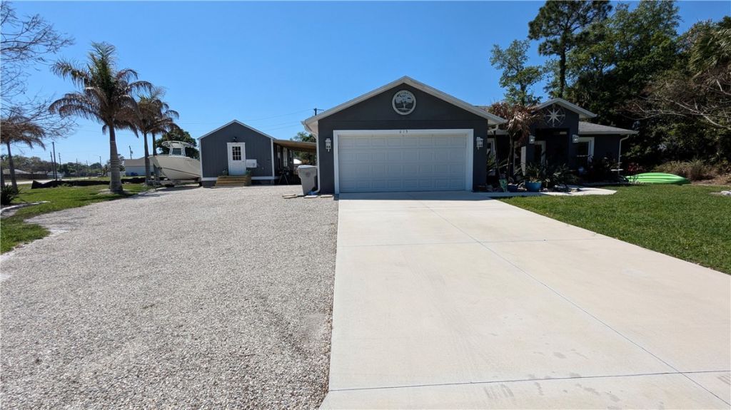 2022 concrete block home featuring 3BR/2BA and 1,571 SF under air. Open layout with vaulted ceilings, split bedrooms, island kitchen, granite counters, and stainless appliances. Induction Range, Exhaust fan, inside laundry, impact glass, and matching laminate throughout. Plantation Shutters 2-car garage and 40 x 10 screened patio. County water/sewer. Fence Backyard. Solar Panels, Bonus 16 x 32 permitted rear In-law Suite/workshop with power and A/C?great for hobbies, storage, or flex space, plus attached 32 x 10 covered area. Next to Gravel parking for 6 cars/boat or RV. Community Pool