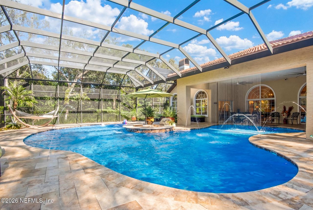 Welcome to 8 Rue Renoir, a beautifully maintained home set on an expansive half-acre lot along the 13th fairway in the guard-gated community of Hammock Dunes in Palm Coast. Offering rare privacy and space, the home features over 3,100 square feet, three bedrooms, three full baths, travertine flooring throughout, and an open layout ideal for everyday living and entertaining.The remodeled kitchen includes granite countertops, gas cooktop, copper farmhouse sink, and custom cabinetry, opening to a warm family room with a natural stone gas fireplace. The spacious great room features 12-foot ceilings, while a secondary bedroom with Murphy bed provides flexible office or guest space.Outside, enjoy a private resort-style backyard with a Pentair saltwater pool, swim-up bar, hot tub, and covered entertaining area surrounded by tropical landscaping and fruit trees. Optional membership to Hammock Dunes Club offers oceanfront golf, dining, tennis, pickleball, fitness, and two clubhouses.