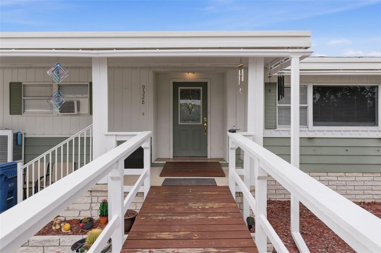 Step into a home that feels welcoming from the moment you arrive, set within High Point, a well-known 55+ golf community where everyday living is relaxed and enjoyable. This 2-bedroom, 2-bath home sits on a 0.35-acre lot and offers a covered carport for shaded parking, while a gently sloped ramp with white railings leads to a covered front porch at the main entry, creating a comfortable and inviting arrival space, and a separate covered storage/workshop to the left adds practical versatility. Inside, the living room opens to the right with laminate flooring that flows throughout the main areas and a front-facing window overlooking the yard, while two coat closets to the left provide convenient storage. Just beyond, the dining area is positioned in the corner next to the kitchen, offering an easy flow for everyday meals. The centrally located kitchen features tile flooring, ample cabinetry, and solid-surface countertops, making it both functional and accessible. Across the way, a spacious family room connects directly to the sunroom, bringing in backyard views and encouraging a natural indoor-outdoor lifestyle. The primary bedroom offers a comfortable retreat with a generously sized walk-in closet and a private en suite bathroom featuring upgraded finishes, a single vanity, and a step-in shower, while the second bedroom is nearby with access to a separate full bathroom that includes tile flooring, a tub-and-shower combination, upgraded details, and solid wood storage cabinets. Toward the back of the home, the laundry room provides tile flooring and built-in shelving for added organization. The sunroom opens to an outdoor patio and a raised wooden deck with wide-plank flooring and solid wood railings, enclosed by a white vinyl fence, and beyond that, the property extends to a wide, open yard with plenty of usable space to enjoy. Nearby attractions include Weeki Wachee Springs State Park, known for its clear spring waters and kayaking opportunities, Suncoast Parkway, offering convenient access toward Tampa for shopping and dining, and Pine Island Park, featuring waterfront views, beach access, and memorable Gulf sunsets.